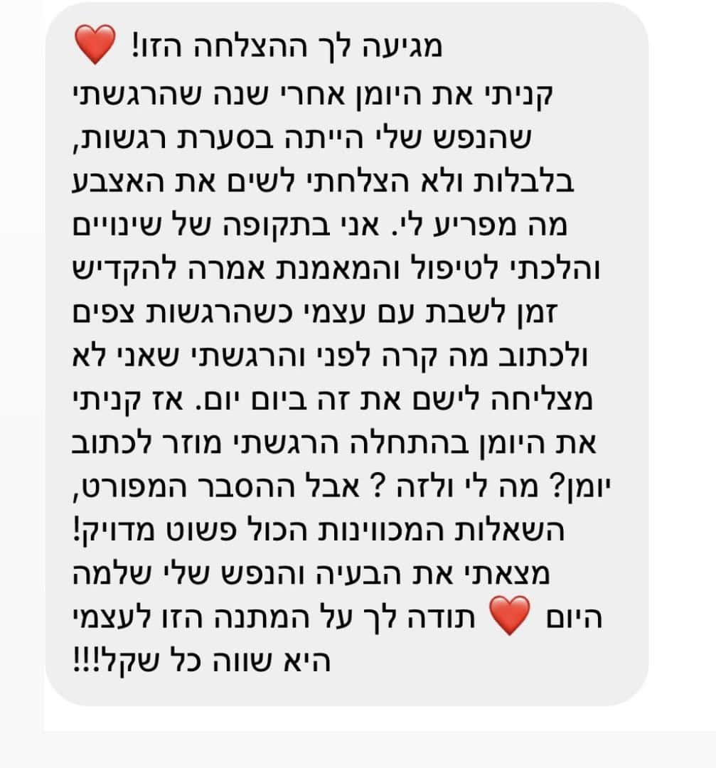 יומן ״הנני״ יעזור לך לחפש באופן אקטיבי אחר הברכות בחיים שלך, לפתח מודעות למחשבות שרצות לך בראש ולעשות בהן סדר, לזהות את הדפוסים האוטומטיים שלך, להבין מה תורם לך, מה ממש לא משרת אותך, ומה אפשר לעשות מול אתגרים שצצים בחיים.